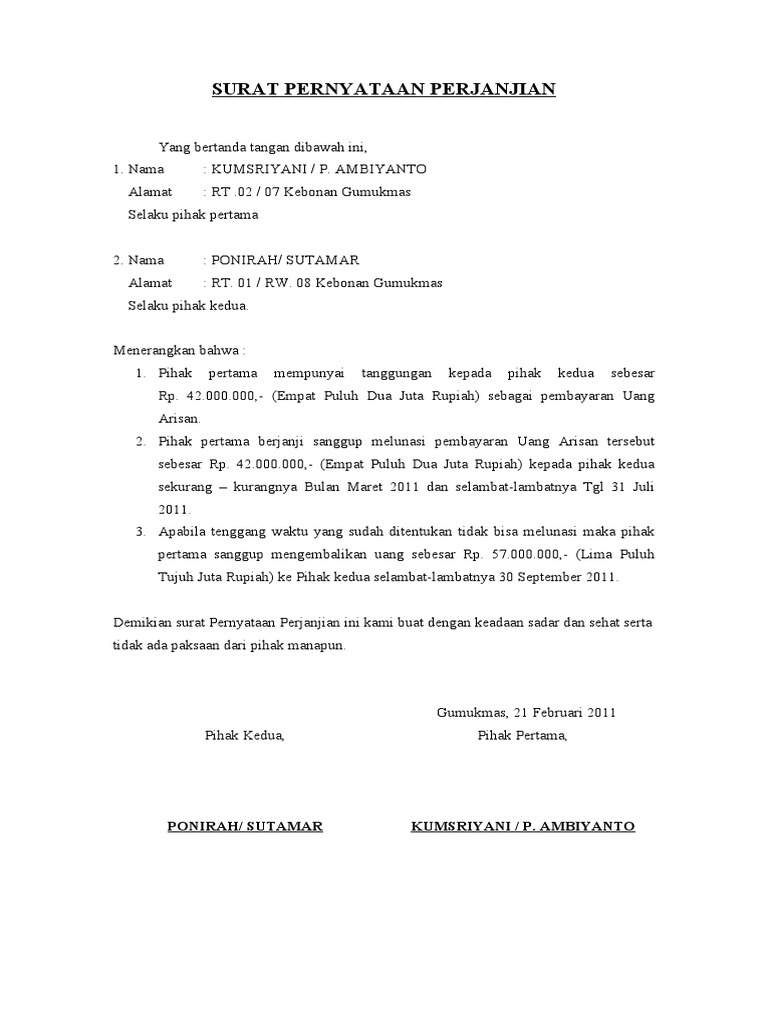 Contoh surat perjanjian jual beli arisan Surat Pernyataan Perjanjian