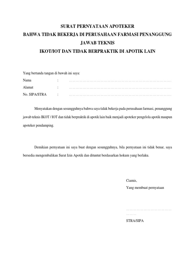 Contoh surat pernyataan apoteker tidak bekerja di tempat lain Surat Keterangan Apoteker